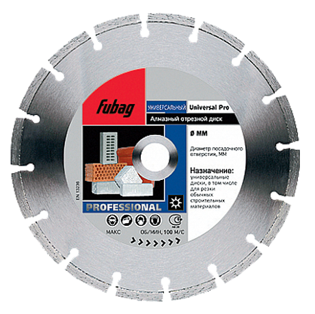 Алмазный диск Fubag Universal Pro является сменным элементом для угловых шлифовальных машин. Применяется для сухого реза Предназначены для обработки бетона, выдержанного бетона, красного кирпича, среднетвёрдого кирпича, строительных материалов. Диски этой программы - лучший выбор для формирования постоянного ассортимента соответствующего отдела строительного супермаркета или специализированного магазина. Маркировка дисков программы Professional включает обозначение обрабатываемого материала и условное обозначение линейки, например: Universal Pro.