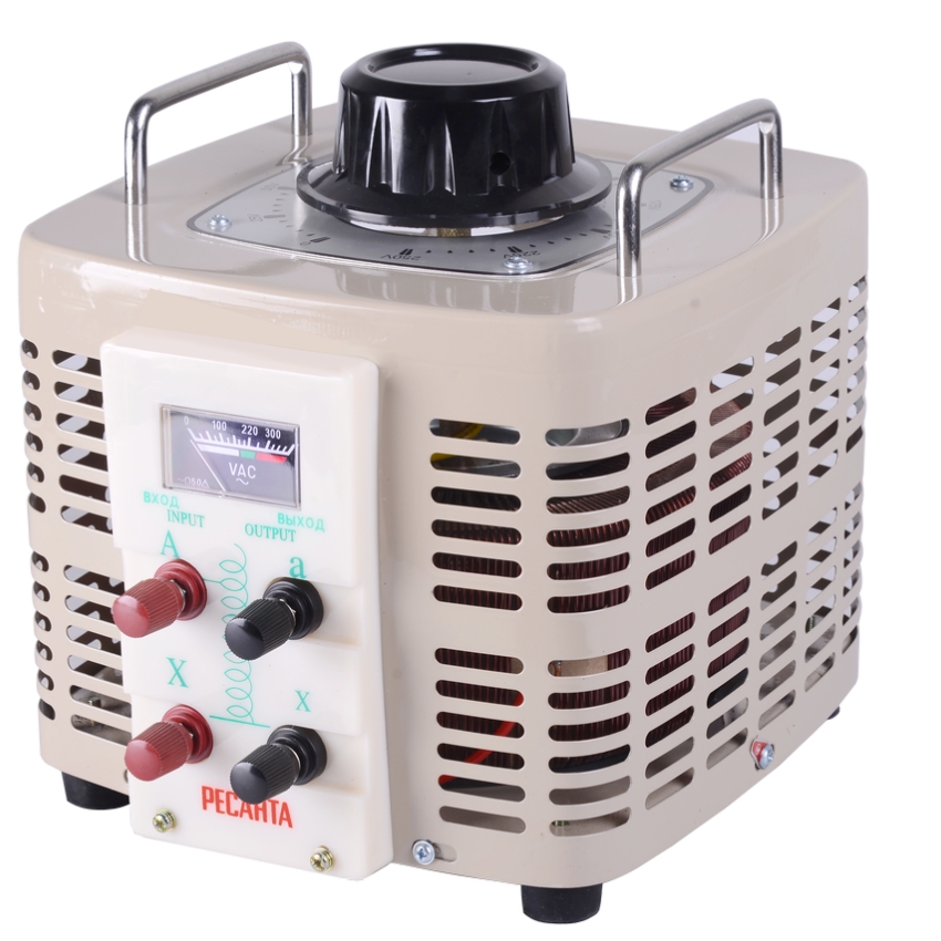 Автотрансформатор Ресанта (ЛАТР) TDGC2-5К 5kVA снабжен шкалой поворота ручки регулятора, вольтметром и клеммными колодками подключения сети и нагрузки. В автотрансформаторе на магнитопроводе расположена одна обмотка. Если автотрансформатором надо понизить напряжение, то все витки включаются в сеть, а к части витков присоединяется электробытовой прибор.