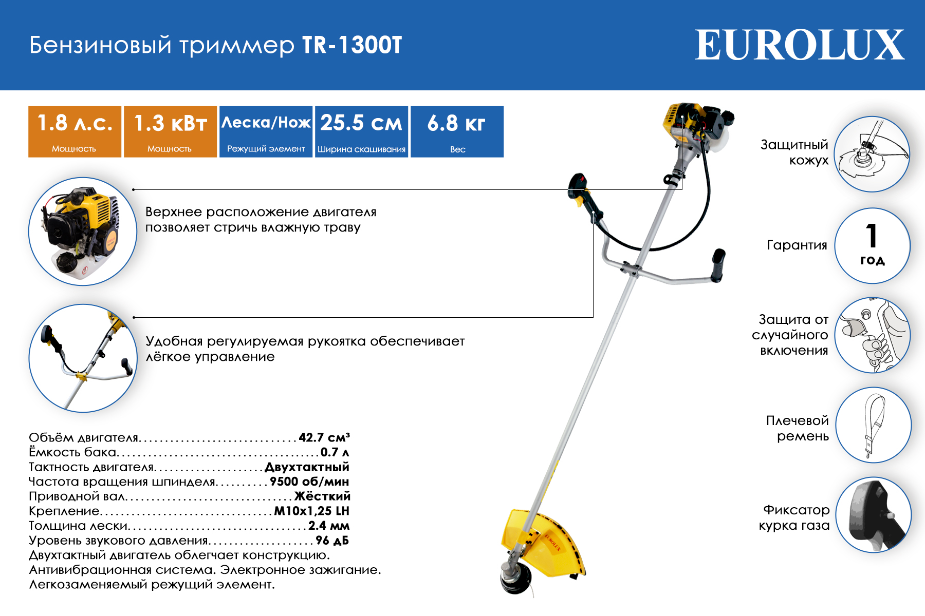 Технические характеристики бензинового триммера Huter TR-1300T Eurolux