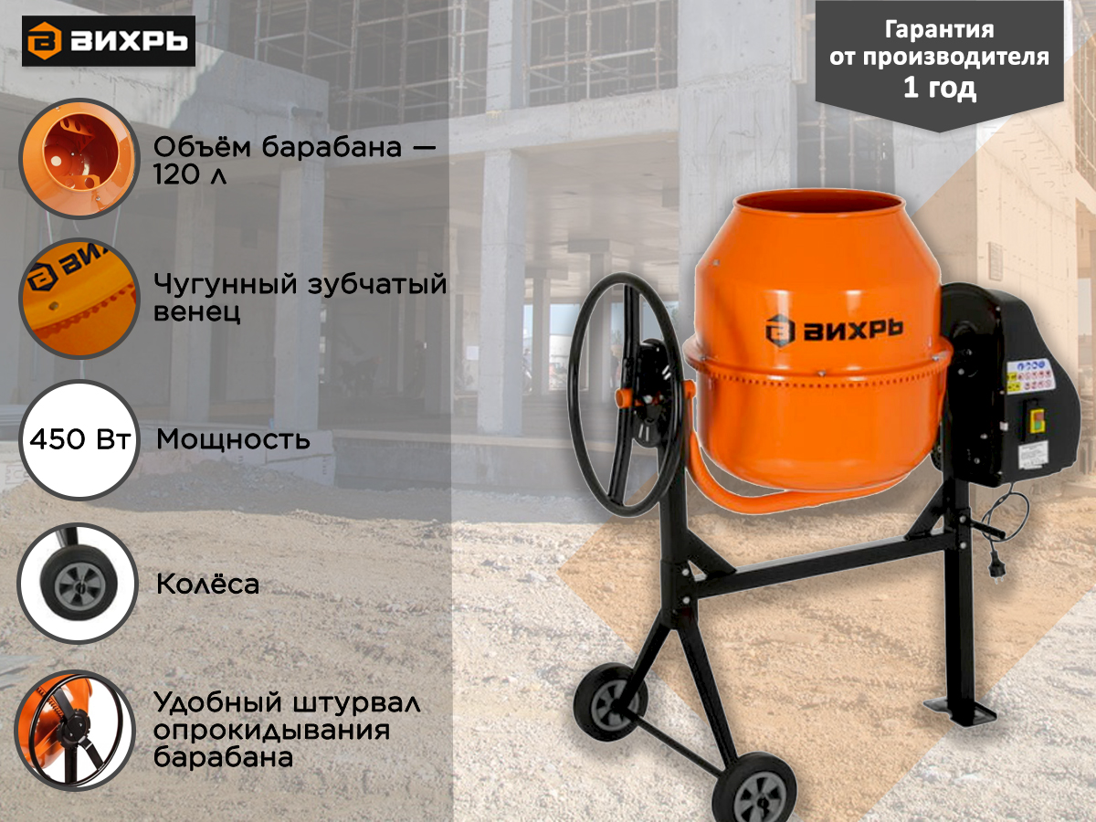 Бетономешалка Вихрь БМ-120 предназначена для приготовления бетона и строительных растворов, состоящих из цемента, наполнителей, твердых добавок и воды. Оптимальна при строительстве домов в или проведении ремонтных работ. Обеспечена транспортировочными колесами на раме, для перемещения к месту проводимых работ.