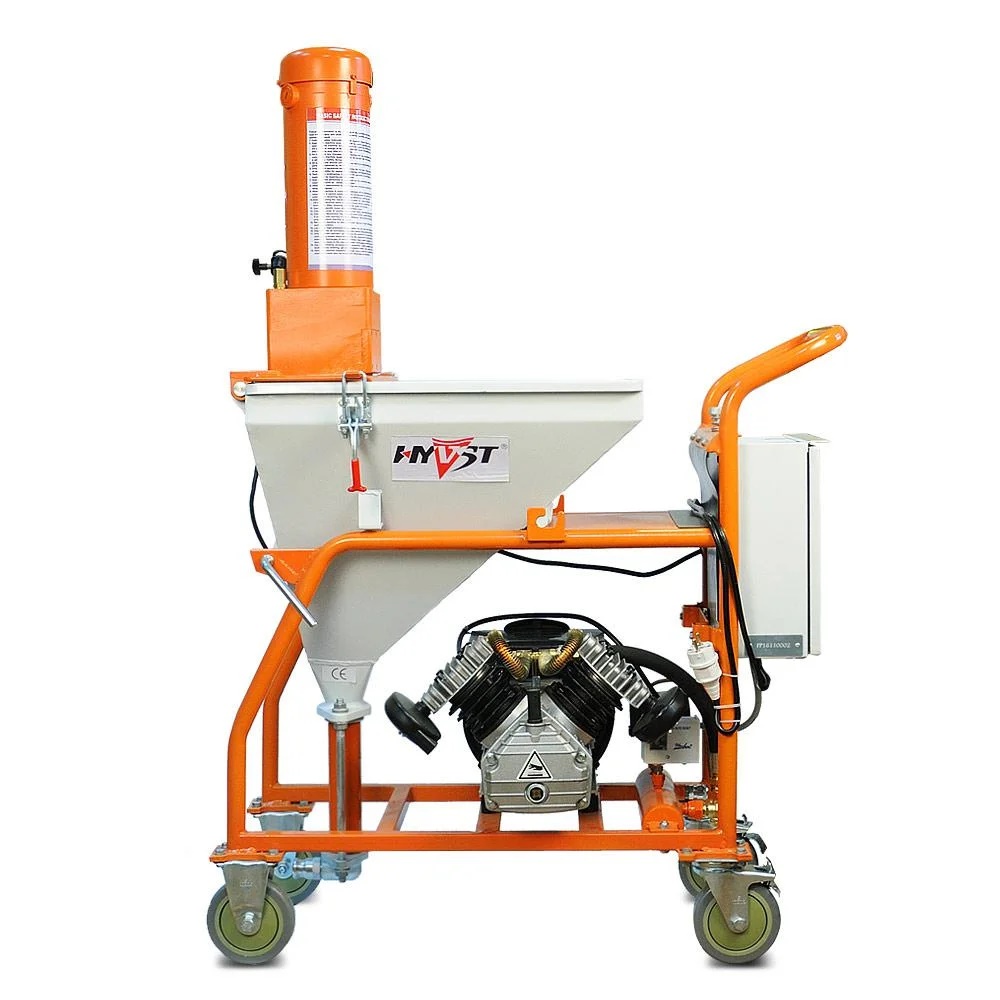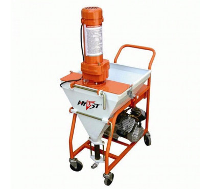 Безвоздушная электрическая установка для нанесения шпатлевки HYVST SPN25 220V 50 HZ - используется для транспортировки готового штукатурного раствора и нанесения штукатурки, и финишной шпатлевки на стену. Применяется со смесями с фракцией до 3 мм. Максимальный объем бункера - 25 литров. Материал под давлением подходит к распылителю, по своему виду и принципу действия, напоминающего брандспойт. Материал набрызгивается на стену вылетая из сопла под высоким давлением. Установка комплектуется двумя пистолетами распылителями: один пистолет для готовой штукатурки, другой для готовой финишной шпатлевки. Финишный шпаклевочный пистолет представляет собой обычный безвоздушный краскопульт с удочкой, на конец удочки накручивается воздушная голова и подводится по трубке воздух, для дополнительного распыления вязких материалов. Машина оборудована четырьмя колесами для удобного перемещения по площадке. Для работы необходимо водоснабжение и подключение к сети с напряжением 220 вольт.