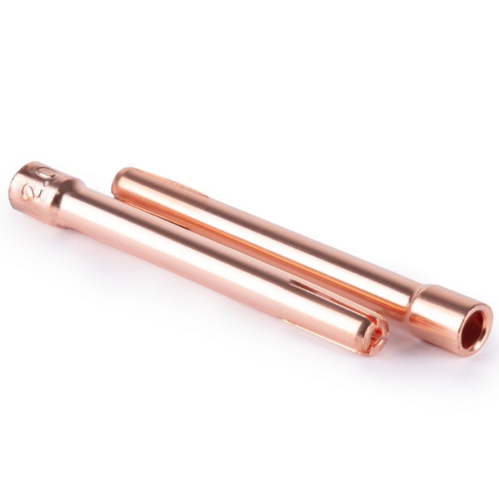 Цанга 2,0мм х 50мм TIG17/18/26 (702.0012/TD0001-20) VARTEG приспособление для фиксации вольфрамового электрода в горелке. На цанге имеются прорези, которые помогают закрепить в зажимных кулачках электрод, за счёт осевого усилия. Цанги имеют повышенный запас прочности и коррозийной устойчивости.