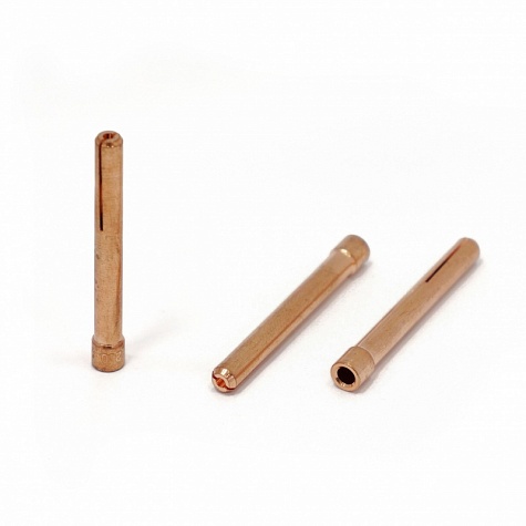 Цанга AUROR d.2.4 50мм фурнитура для фиксации вольфрамового электрода в горелке. На цанге имеются прорези, которые помогают закрепить в зажимных кулачках электрод, за счёт осевого усилия. Цанга имеет повышенный запас прочности и коррозийную устойчивость.