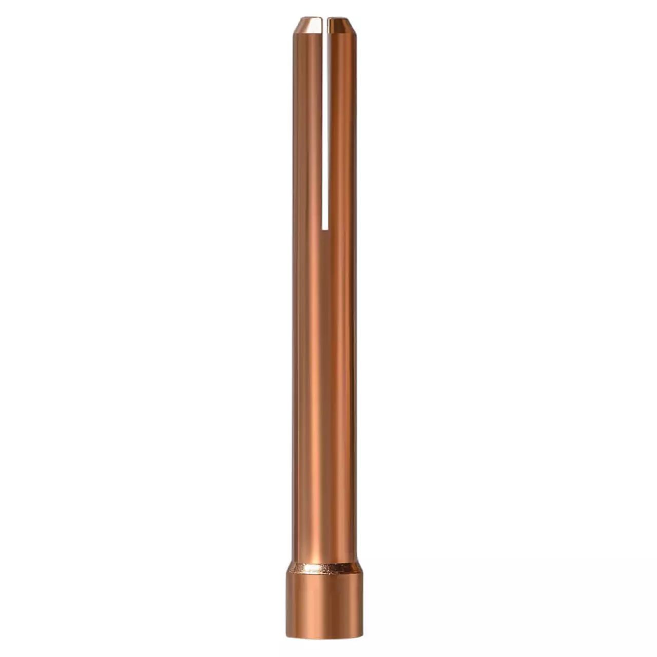 Цанга диаметром 2,4 мм выполнена из меди и вставляется в держатель цанги. Служит для плотной фиксации вольфрамового электрода в горелке TIG. Диаметр цанги должен совпадать с диаметром вольфрамового электрода, а также с диаметром держателя цанги. Совместима с горелками TIG серии TP 17/18/26.