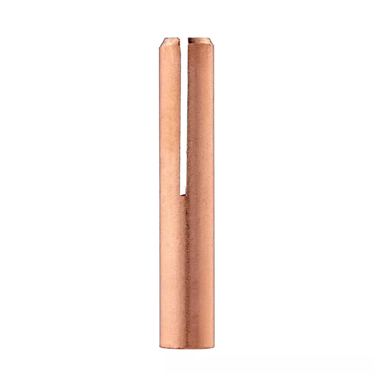 Цанга выполнена из меди и вставляется в держатель цанги. Служит для плотной фиксации вольфрамового электрода в горелке TIG. Диаметр цанги 3,2 мм, и он должен совпадать с диаметром вольфрамового электрода, а также с диаметром держателя цанги. Цанга совместима с горелками TIG TP 9/20/25.