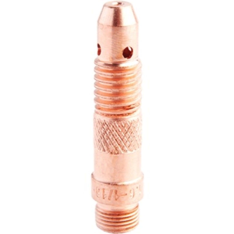 Держатель цанги Сварог (г/л) 2,4 (TS 17–18–26) используется для установки и надежной фиксации цанги в сопле горелки. Отверстия на держателе предназначены для равномерного распределения защитного газа в сопле, тем самым держатель также выполняет функции газового диффузора во время TIG-сварки. Изготовлен держатель цанги из меди.
