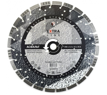 Диск алмазный сегментный Асфальт Extra Line (450х3,5х12х25,4) DIAM 000621 - предназначен для резчиков швов, бензорезов, камнерезных станков. Применяется для сухого и мокрого реза асфальта, асфальтобетона, пенобетона, абразивного песчаника, шамотного и силикатного кирпича. Сухой рез позволяет работать диском без водяного охлаждения, что важно, например, для работ при минусовых температурах. Диск изготовлен с применением лазерной сварки сегментов к корпусу, что обеспечивает прочное соединение и практически исключает отрыв сегмента в процессе работы. Корпус диска изготовлен из специальной закаленной стали, что обеспечивает большую прочность, твердость и устойчивость к нагрузкам и перегреву.