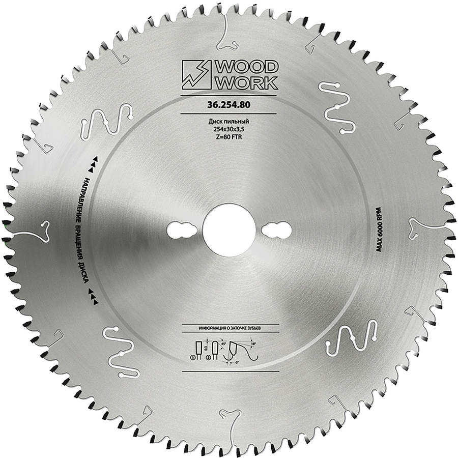 Технические характеристики диска пильного 254x30x3.5 FTR Z=80 по алюминию A=-5° WOODWORK