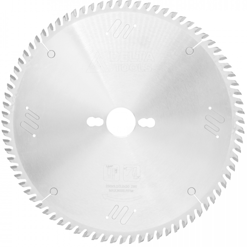 Диск пильный для ФРС DELTA TOOLS 250x3.2/2.2x30 Z=80 трапеция 5гр. по ЛДСП, МДФ используется для пиления биламинированных панелей с меламиновыми покрытием и не облицованных плит ДСП, MDF на форматно-раскроечных станках с использованием подрезной пилы. Применяется на горизонтальных, форматно-раскроечных станках, центрах с ЧПУ, панельных пилах.