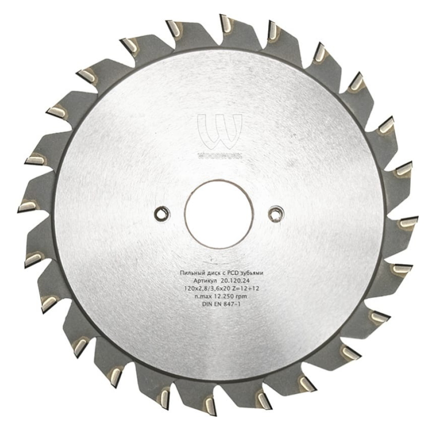 Диск пильный с PCD зубьями 120 2.8-3.6х20 Z=12+12 WOODWORK используется на горизонтальных/вертикальных форматно-раскроечных станках с подрезным узлом для распиловки ЛДСП и МДФ.