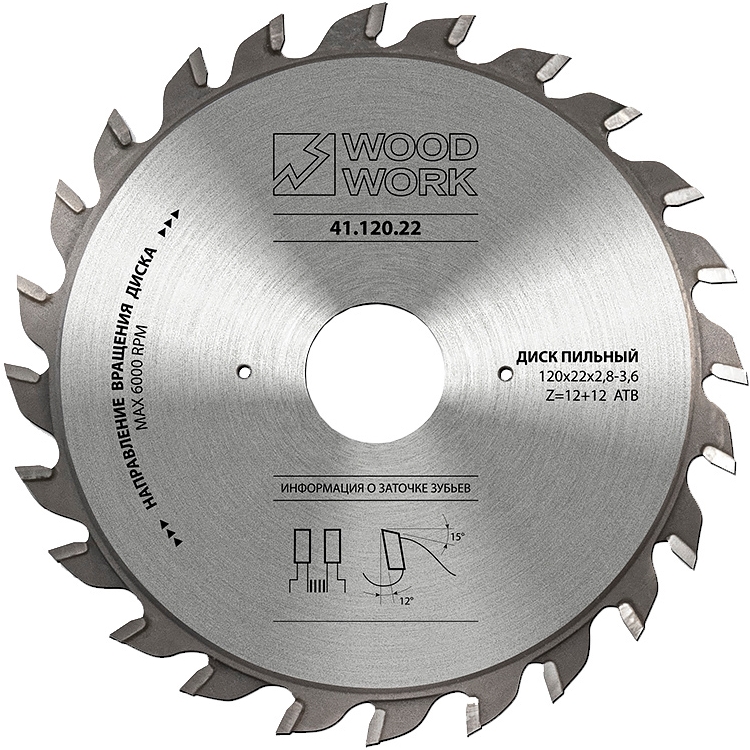 Диск подрезной Woodwork (D120 B/b2.8-3.6/2.0 d22 Z12+12 α10°) по ЛДСП и прочим ламинированным или шпонированным панелям
