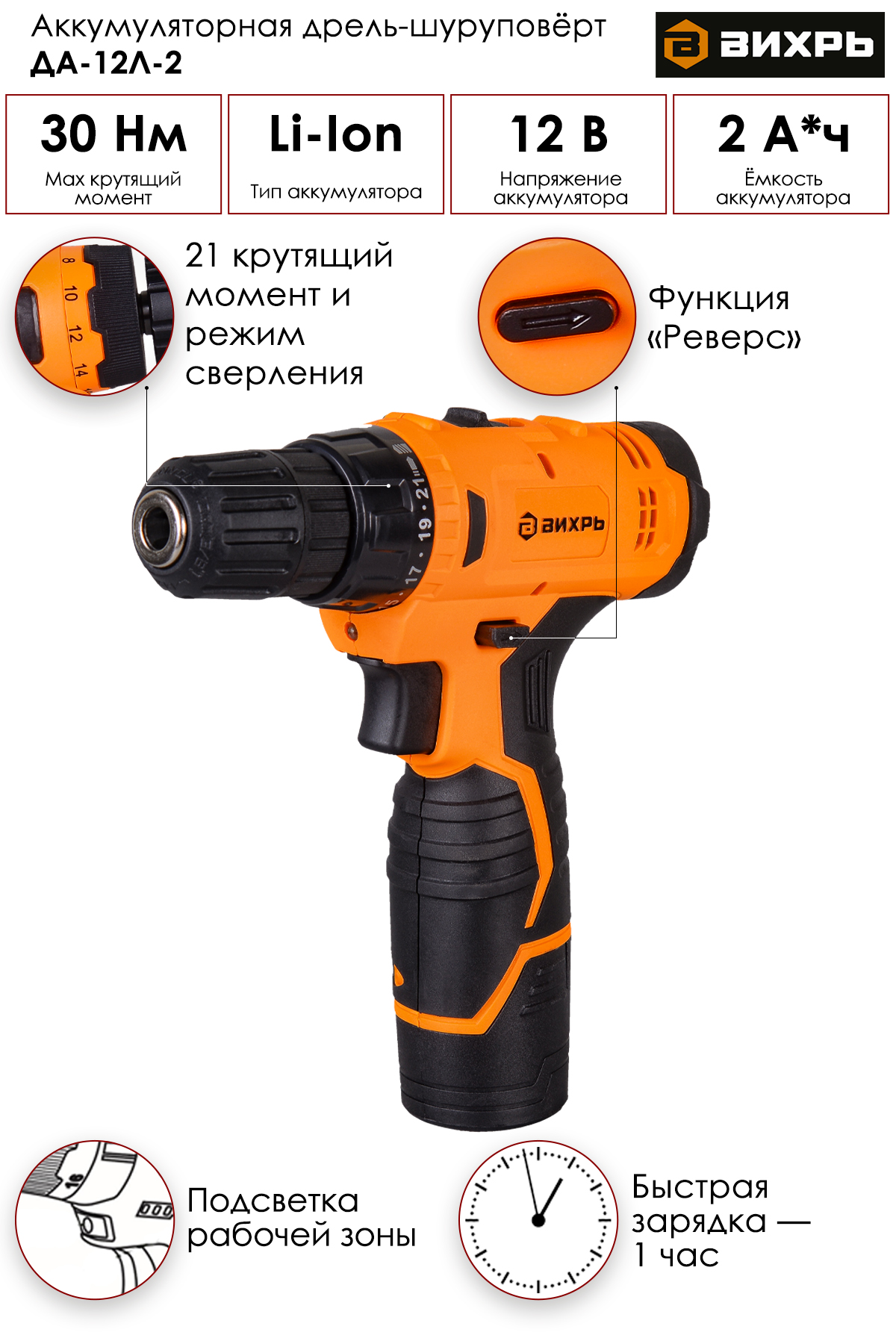 Технические характеристики дрели-шуруповерта аккумуляторной ДА-12Л-2 Вихрь