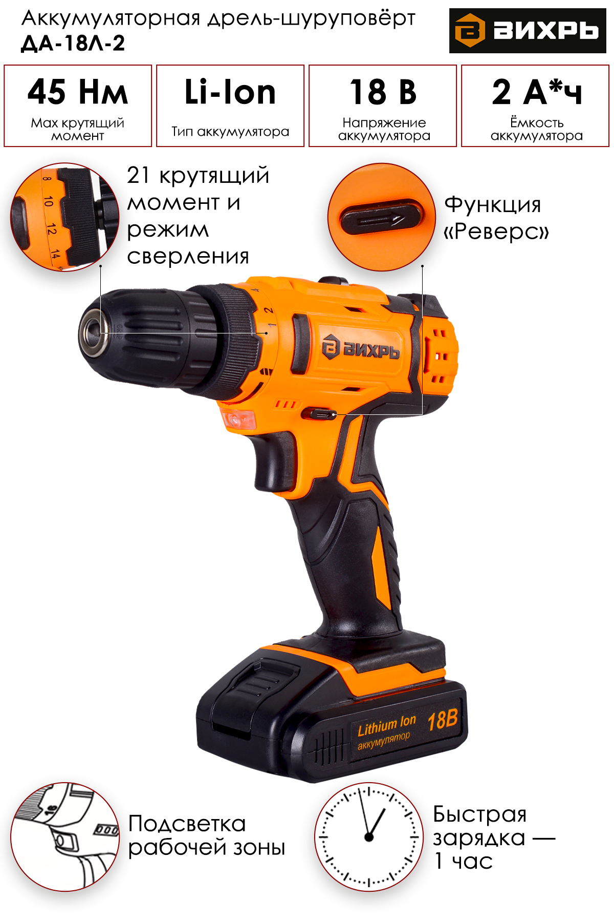 Дрель-шуруповерт аккумуляторная ДА-18Л-2 Вихрь относится к безударному типу. Модель оборудована быстрозажимным патроном, который отличается удобством смены оснащения. Шуруповерт отличается функциональностью: предусмотрены подсветка рабочей зоны и электронная защита от перегрузок.