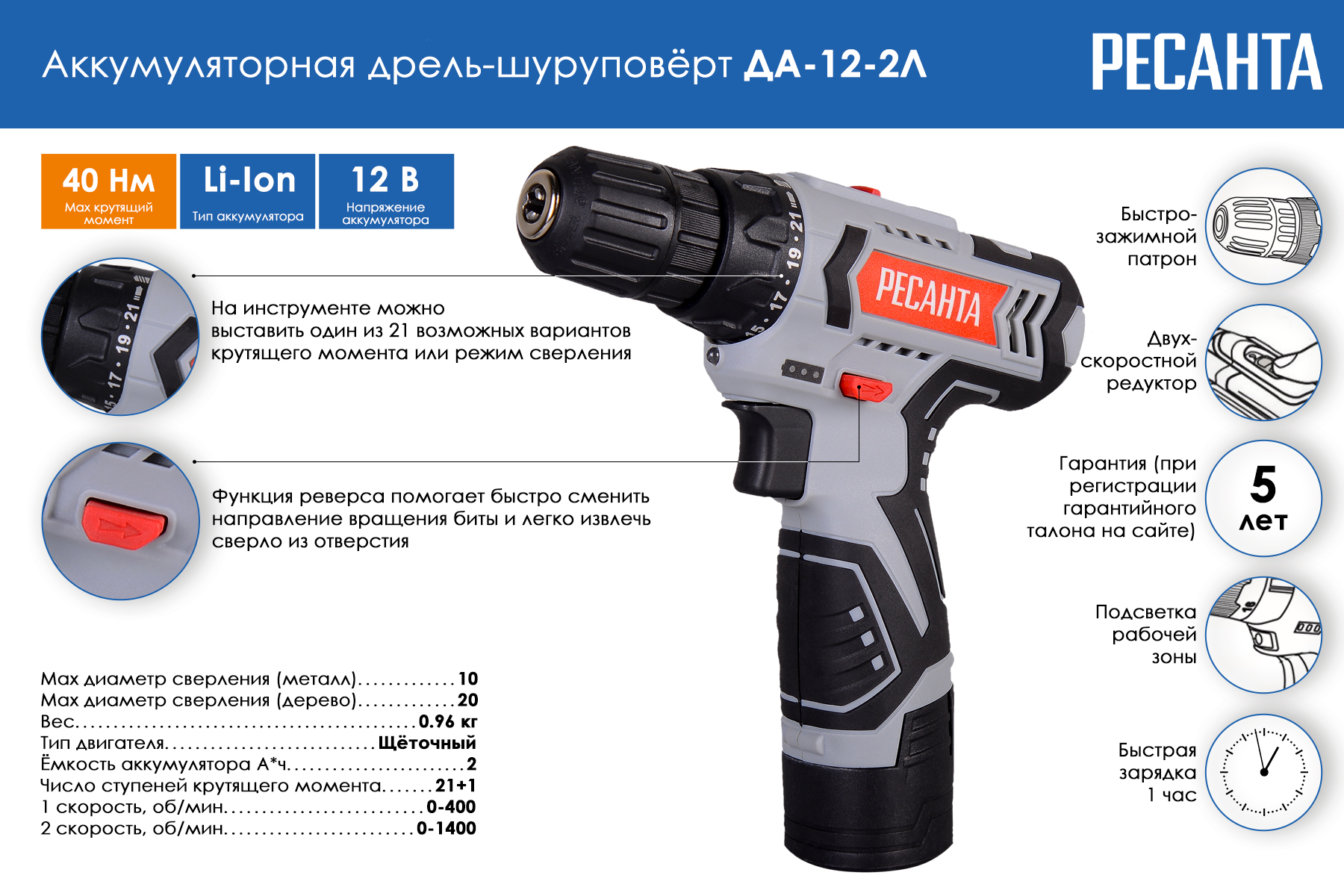 Технические характеристики дрели-шуруповерта аккумуляторного Ресанта ДА-12-2Л 75/14/1
