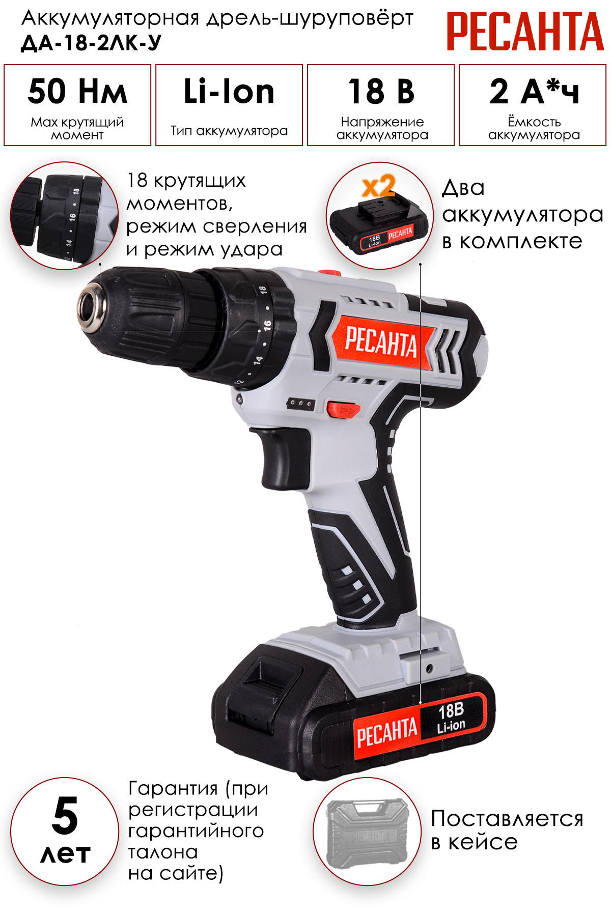 Дрель-шуруповерт аккумуляторная Ресанта ДА-18-2ЛК-У 75/14/6