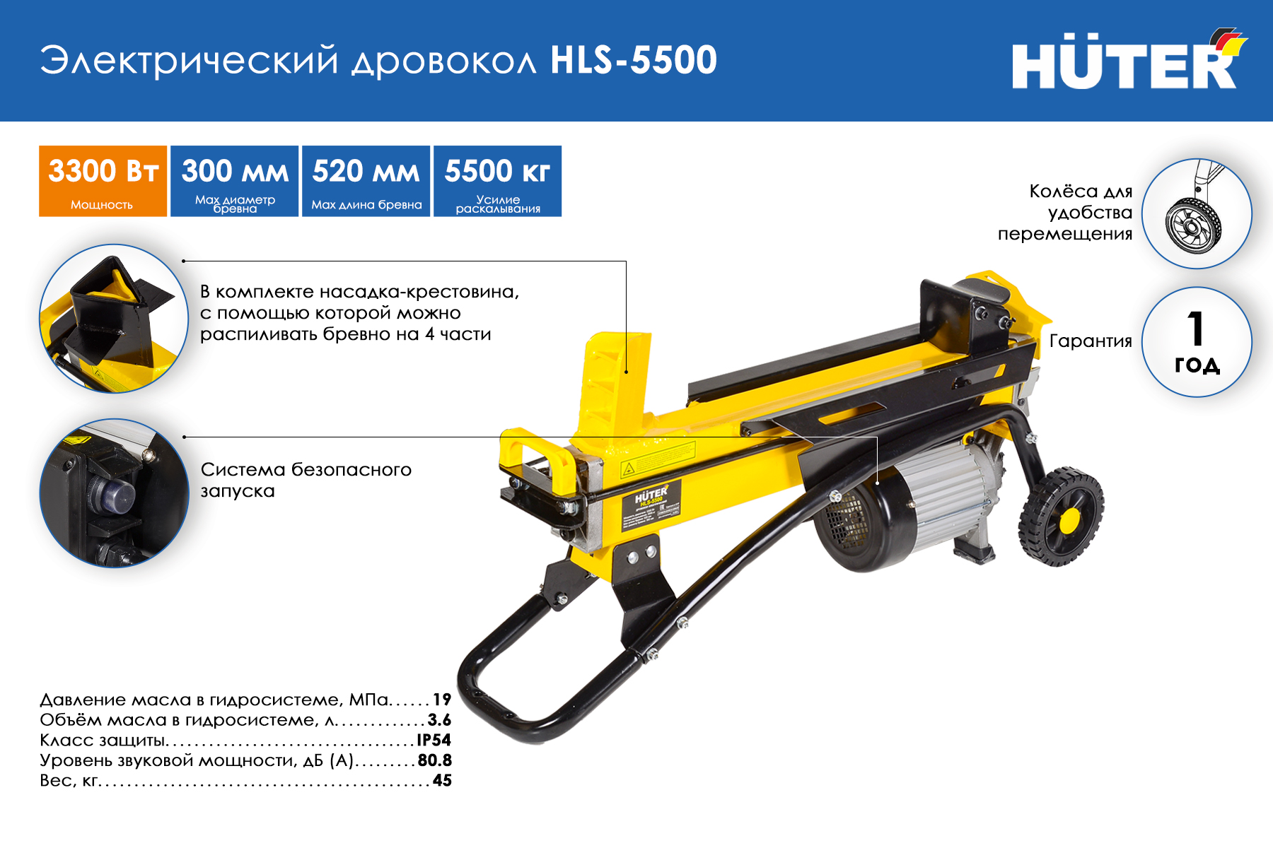 Дровокол электрический Huter HLS-5500 используется для заготовки дров методом раскола древесины. Высокая мощность двигателя позволит справиться практически с любым видом древесины.