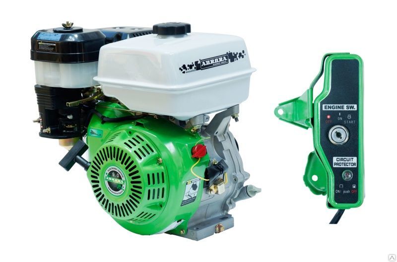 Двигатель AURORA АЕ-9D / Р одноцилиндровый бензиновый 4-хтактный двигатель принудительного воздушного охлаждения. Используется для установки на бензиновые генераторы, мотопомпы, мотокультиваторы, мотоблоки, снегоуборщики и другую технику. Имеется датчик регулировки масла, размыкающий цепь зажигания при падении уровня масла.
