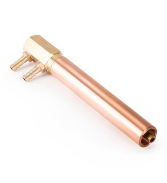 Электрододержатель предназначен для машин контактной сварки МТ-25/40/63, произведённых после 2018 года. Служит для передачи сварочного тока от плеча контактной машины на электрод, а также для охлаждения контактного электрода. Электрододержатель представляет собой трубку внешним диаметром 25 мм, с одной стороны внутренний конус для посадки электрода, с другой стороны резьба для подключения подвода охлаждения с двумя штуцерами. Состоит из медного сплава. Длина 150 мм.