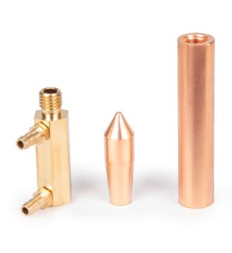 Электрододержатель предназначен для машин контактной сварки МТР, произведённых после 2018 года. Служит для передачи сварочного тока от плеча контактной машины на электрод, а также для охлаждения контактного электрода. Электрододержатель представляет собой трубку внешним диаметром 18 мм, с одной стороны внутренний конус для посадки электрода, с другой стороны резьба для подключения подвода охлаждения с двумя штуцерами. Состоит из медного сплава. Длина 170 мм.