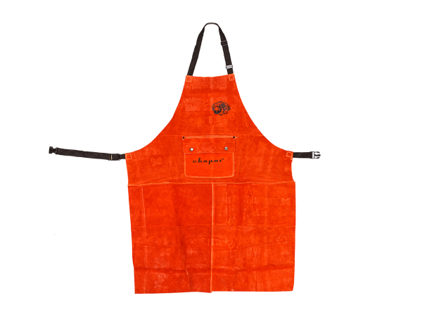 Фартук изготавливается из шлифованного, прочного и долговечного спилка. Швы укреплены двойной строчкой прочными нитками. Ремни изготовлены из синтетической прочной тесьмы. Имеется регулировка на шее и удобная застежка фастекс на поясе, что обеспечивает надежную фиксацию фартука. Имеет нашитый карман с клапаном на металлических кнопках. Спилковый фартук имеет высокую прочность. Размер фартука (ДxШ): 90x70 см