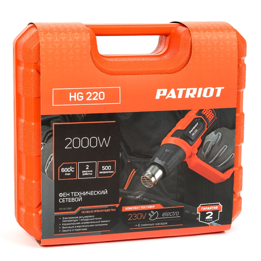Фен технический PATRIOT HG 220 используется для реставрации и отделки. Нагреватьльный элемент имеет дополнительную керамическую изоляцию, что гарантирует долгий срок службы инструмента. Прорезиненная рукоятка ExtraGrip способствует комфортному рабочему процессу. В комплект входят насадки, которые расширяют сферу применения фена.