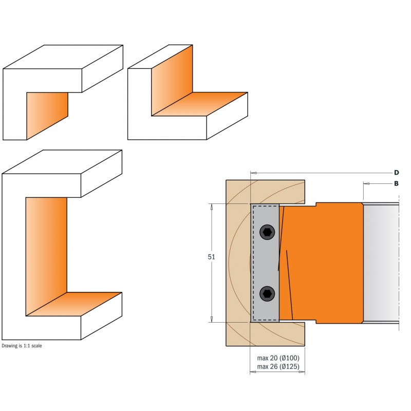 Фреза четвертная СМТ F=40 D=125x50 насадная (алюм.) смен.ножи HM (кейс), из алюминиевого корпуса со сменными ножами HM в кейсе. Фрезу используют для выборки четверти сверху и снизу, сращивания, пазования, на стационарных фрезерных станках, комбинированный станок по материалам такие как ДСП, МДФ, ЛДСП, дерево, OSB, пластики, ламинированные материалы.