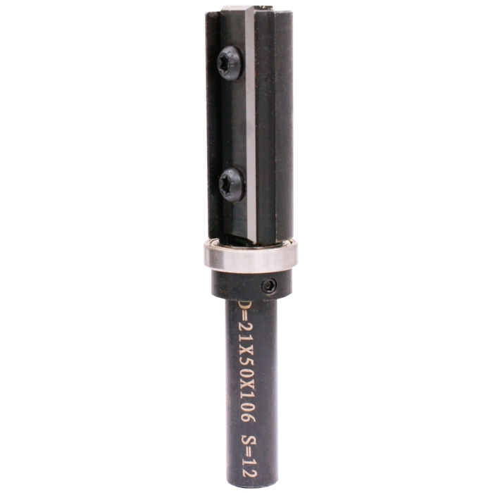 Фреза обгонная со сменными ножами верхний подшипник DELTA TOOLS D=21x50x106 S=12 используется для чистовой криволинейной/прямолинейной фрезеровки материала по копиру (шаблону) после черновой обработки фрезеруемой детали. Применяется на фрезерных станках.