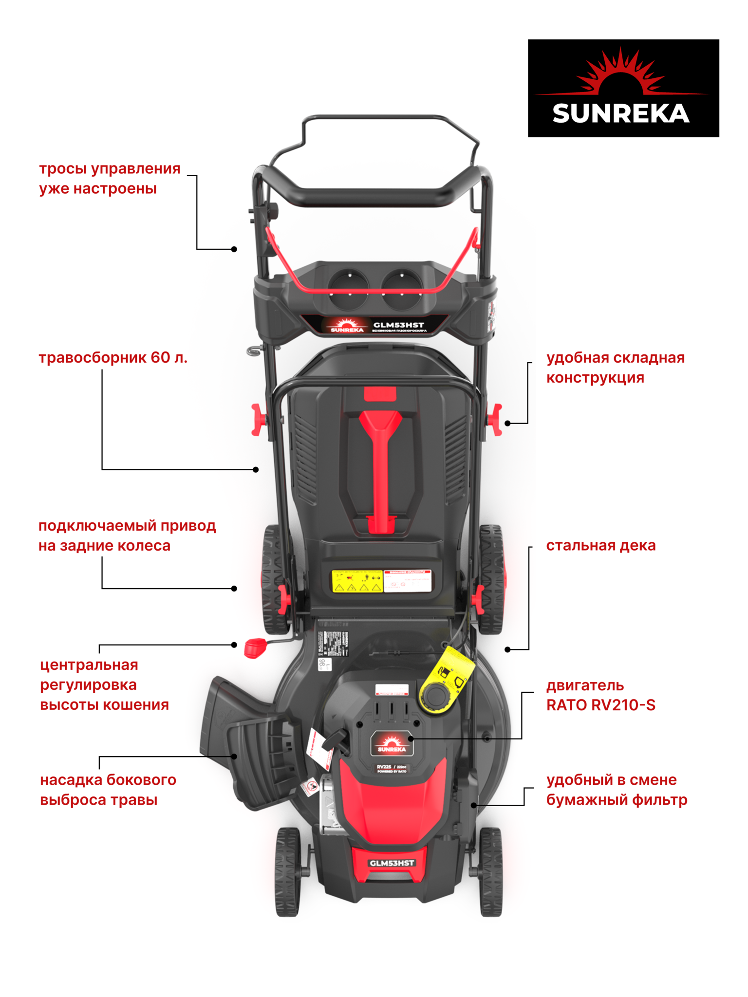 Бензиновая газонокосилка SUNREKA GLM51S с шириной скоса 51см предназначена для ухода за газоном на садовом и дачном участке средних и больших размеров. Привод на задние колеса значительно облегчает работу, а двигатель рабочим объемом 209сс и диаметр ножа 51см позволяют выполнять работы по уходу за газоном на участках средней площади максимально комфортно и с минимальными расходами на топливо.