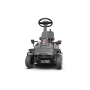 Комфорт оператора обеспечивается регулируемым сиденьем с возможностью перемещения вперед-назад. Отдельное сцепление привода ножа позволяет включать и выключать вращение ножей независимо от движения райдера. Топливный бак объемом 7 литров обеспечивает до 1 часа 35 минут непрерывной работы при среднем расходе топлива 2.5 л/ч.