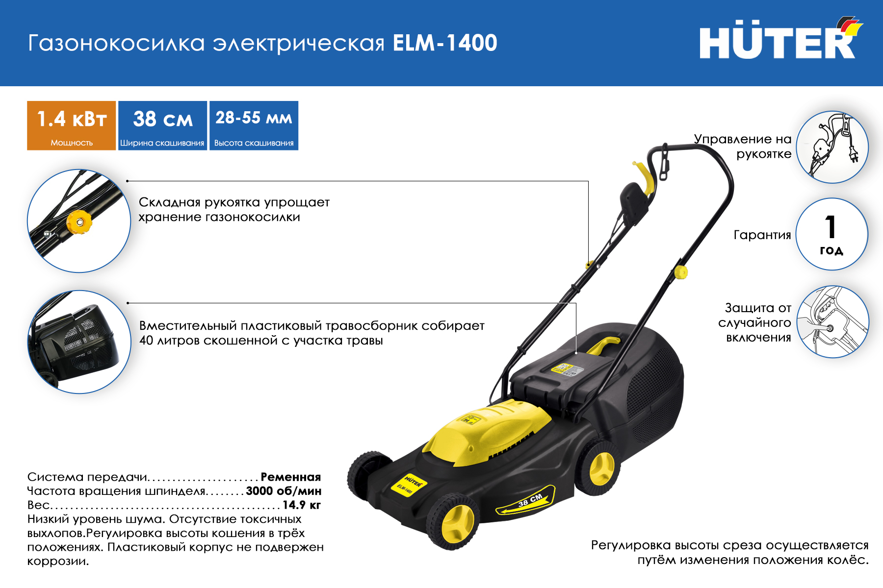Электрическая газонокосилка Huter ELM 1400 используется для удаления травы на дачах или на территории загородного дома. В комплект входят все необходимые составляющие для оптимальной работы и быстрой обработки любых площадей.