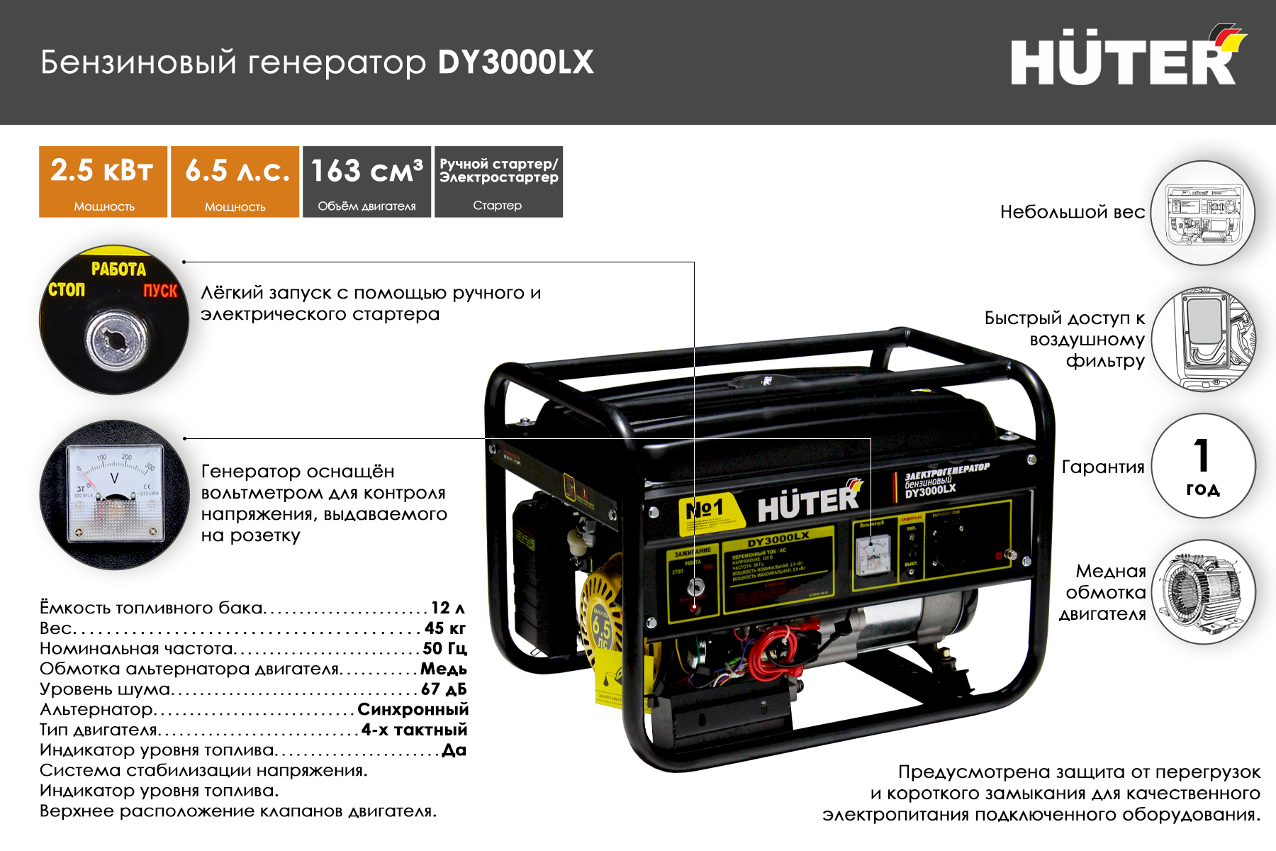 Технические характеристики генератор бензиновый huter dy3000lx