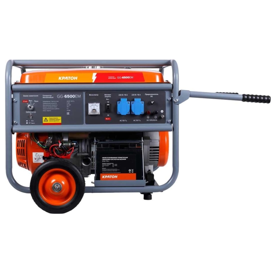 Генератор бензиновый Кратон GG-6500Е используется в качестве вспомогательного источника электропитания. Удобно перевозить по рабочей зоне, например по строительной площадке.