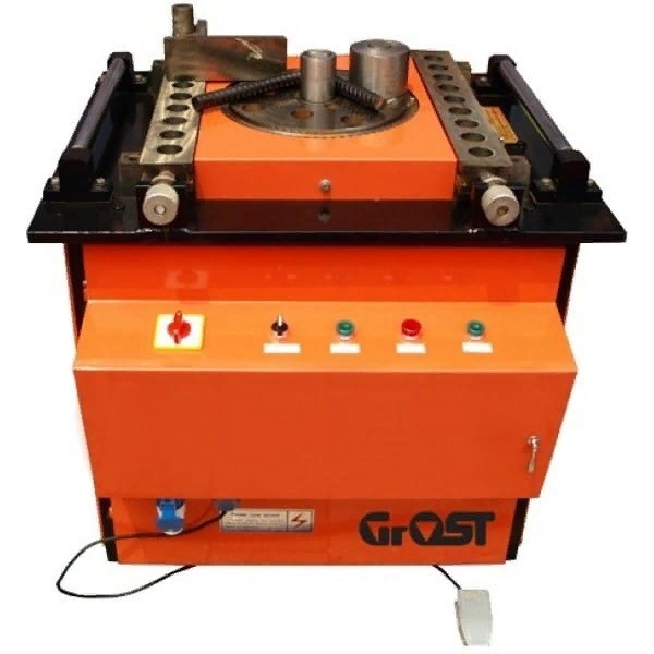 Гибщик арматуры GROST RB-50A - оснащен автоматической системой гибки, что позволяет обрабатывать одинаковые заготовки на поточном производстве. Поворот и возврат в исходное положение осуществляется автоматически, достаточно лишь однократного нажатия на педаль. Агрегат характеризуется надежностью и высокой производительностью. Для удобства пользователя модель оснащена индикатором состояния включения. Педаль ножного управления освобождает руки и существенно облегчает задачу оператора. Широкий набор гибочных роликов и пальцев способствует качественной обработки арматурных стержней различного диаметра (до 50 мм). На поверхности стола расположены металлические кольца для перемещения станка при помощи грузоподъемного механизма.