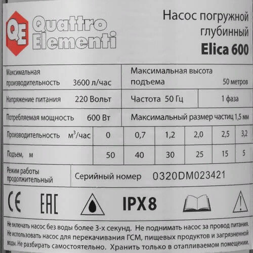 Глубинный насос QUATTRO ELEMENTI ELICA 600