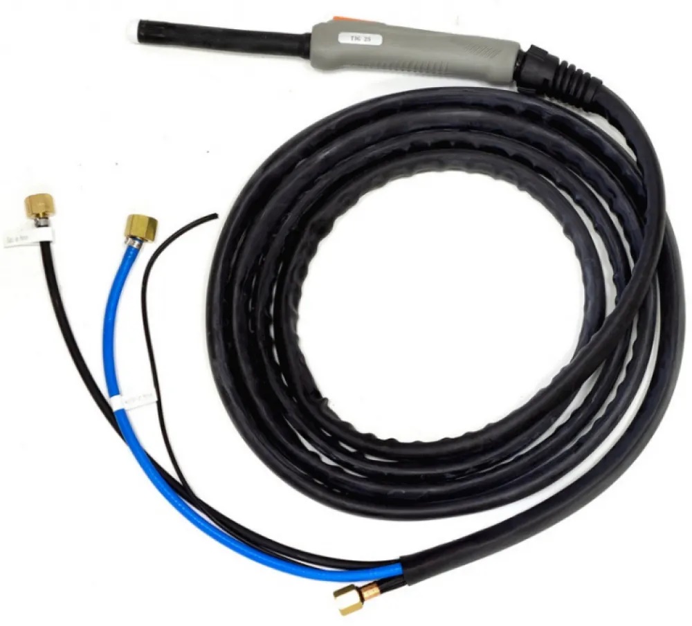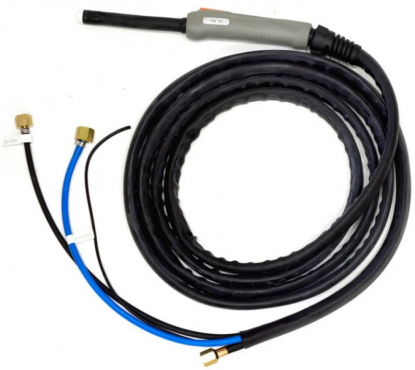 Горелка - используется для ручной дуговой сварки неплавящимся электродом в среде инертных газов. Горелка с усиленным водяным охлаждением, оснащена по ЕВРО стандарту: силовой шланг М12х1, газовый шланг 1/4G, водный шланг 3/8G. В комплекте поставки управляющие разъёмы 2/3/5 pin. Горелка должна дополнительно укомплектовываться силовым разъемом TIG PLUG 50 со шлангом на воду 0.6м с б/р соединителем.
