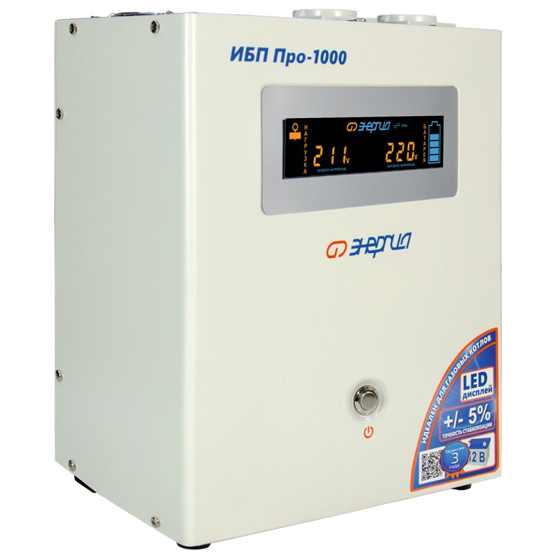 ИБП Энергия Pro-1000 12V предназначен для стабилизации сетевого напряжения, а также обеспечения автономного электропитания потребителей напряжением 220 Вольт чистой синусоидальной формы.
