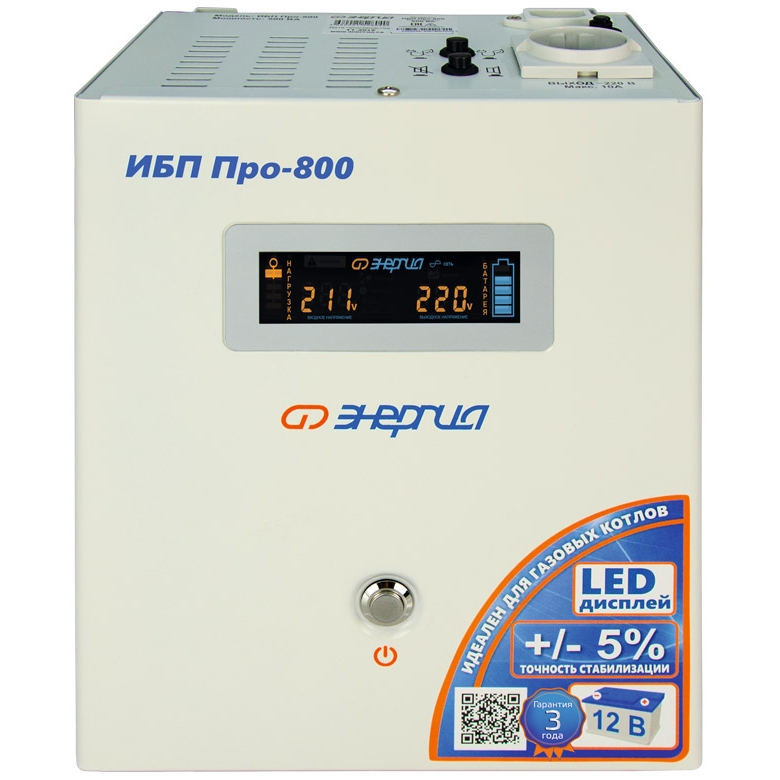 ИБП Энергия Pro- 800 12V предназначен для стабилизации сетевого напряжения, а также обеспечения автономного электропитания потребителей напряжением 220 Вольт чистой синусоидальной формы.