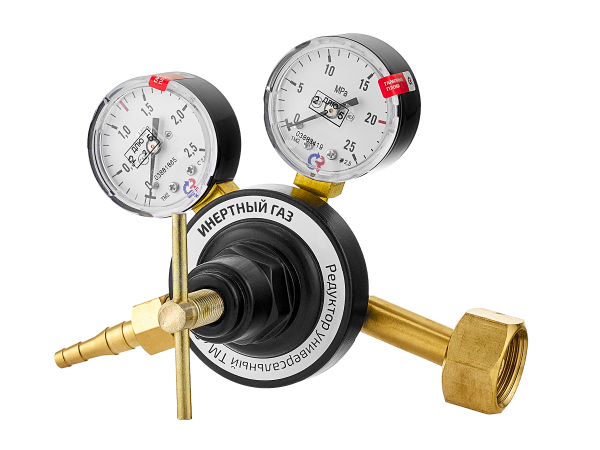 Редуктор универсальный для инертных газов с поверенными манометрами — модель в прочном латунном корпусе, предназначенная для понижения давления газа (аргон, азот, гелий и другие инертные газы), поступающего из баллона, и автоматического поддержания постоянного рабочего давления.