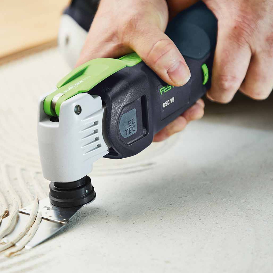 Инструмент многофункциональный FESTOOL OSC 18 E-Basic используется для создания выборки четвертей, вырезов и погружных пропилов в древесине, ламинированной древесине, окрашенной древесине, композитных материалах, стеклопластике, гипсокартоне, цветных металлах, пластмассе, а также для других операций.