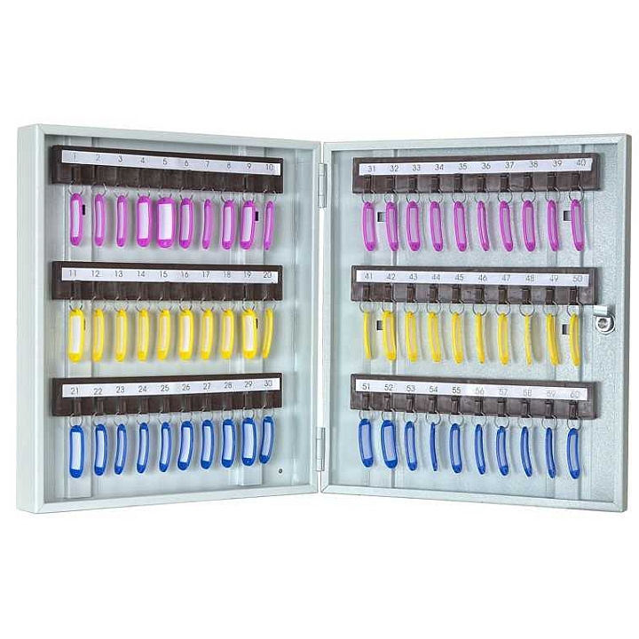 Ключница МетКон КЛ-60 б предназначена для хранения 60 комплектов ключей. На задней стенке корпуса расположены отверстия для крепления. Ключница комплектуется 6 планками под навеску ключей. В дверь установлен замок типа «Cam-Lock». По желанию заказчика ключница может комплектоваться брелоками.