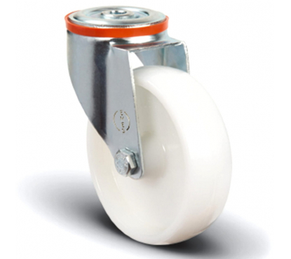 Колесо нейлоновое поворотное под болт М12 125мм EM04-ZKZ-125 используется для оборудования тележек.