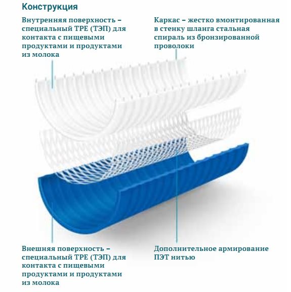 Композитный шланг VacuumPress MILK – применяется для перекачки молока и жидкостей с содержанием алкоголя с содержанием спирта до 20% на молочных комбинатах и фермах. Соответствует требованиям регламента ТС для контакта с молоком и продуктами из молока. Инертный по отношению к молоку. Рекомендуется использовать шланг в температурном режиме от -60 °С до +80 °С (кратковременно до +110 °С).
