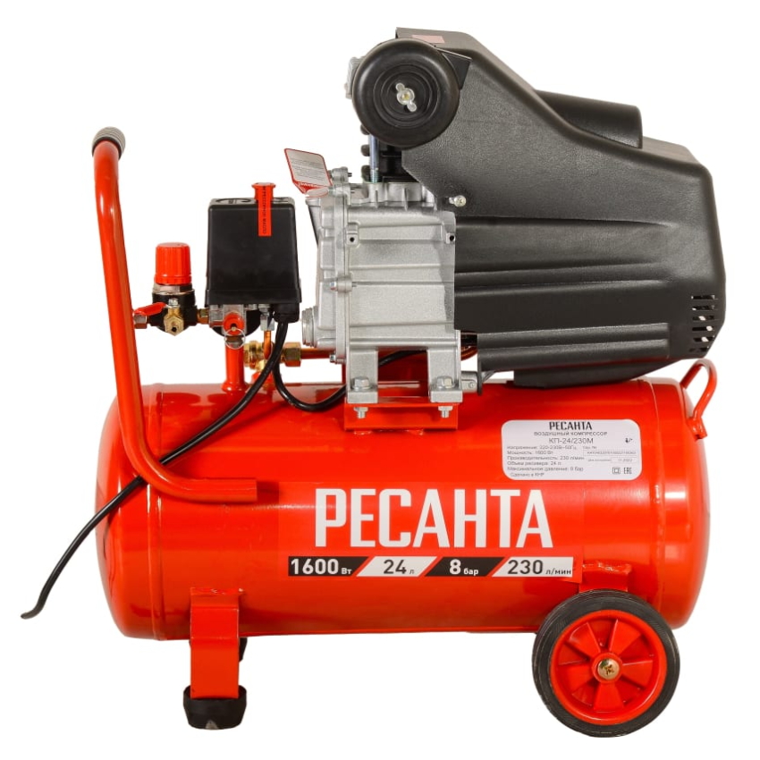 Компрессор Ресанта КП-24/230М предназначен для нагнетания сжатого воздуха в различное пневмооборудование в ходе строительно-ремонтных работ. Максимальная производительность компрессора 230 литров в минуту, объем ресивера 24 литра.