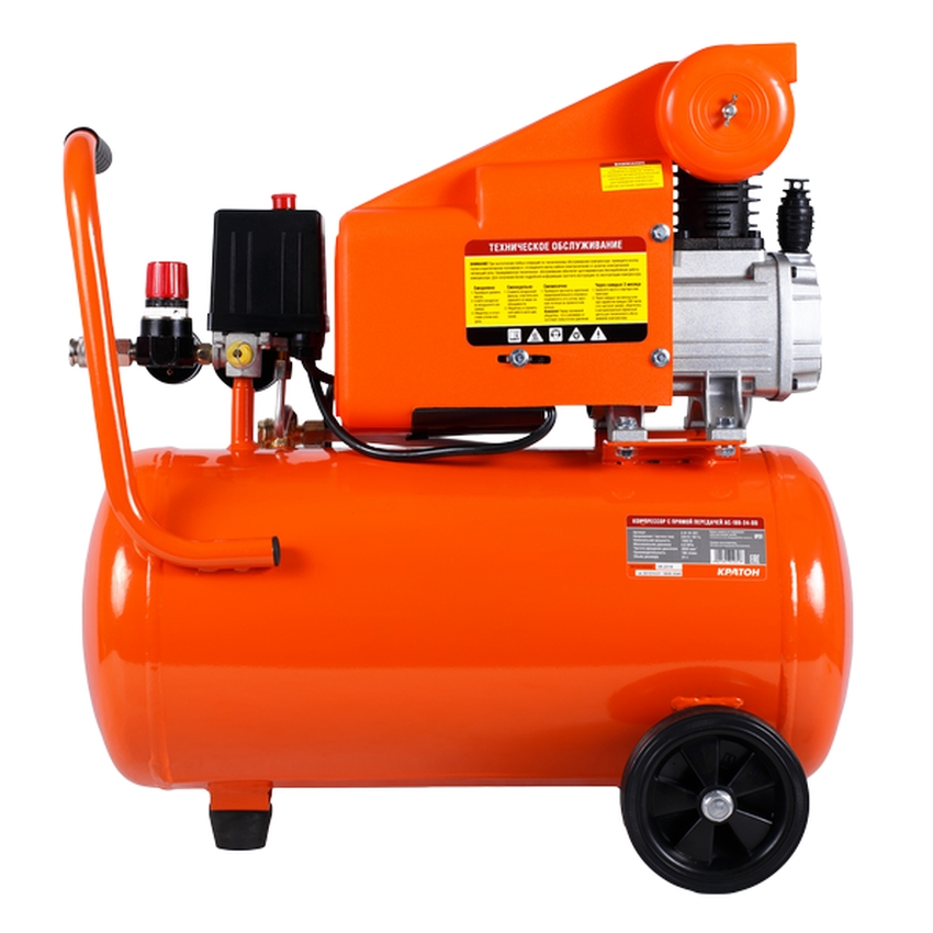 Компрессор с прямой передачей Кратон AC-180-24-DD имеет встроенную защиту от перегрева электромотора. Также одноцилиндровая модель оснащена предохранительным клапаном, через который происходит стравливание излишнего давления при перегрузке ресивера.