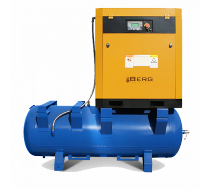 Компрессор винтовой BERG ВК-5.5Р-500 7-10 бар на горизонтальном ресивере ременной привод IP54 нагнетает воздушную массу типа винтовой пары. При ременном приводе компрессорный блок соединен посредством шкивов и ремней с приводным двигателем. Компоновка компрессора на ресивере позволяет существенно сэкономить место в помещении.