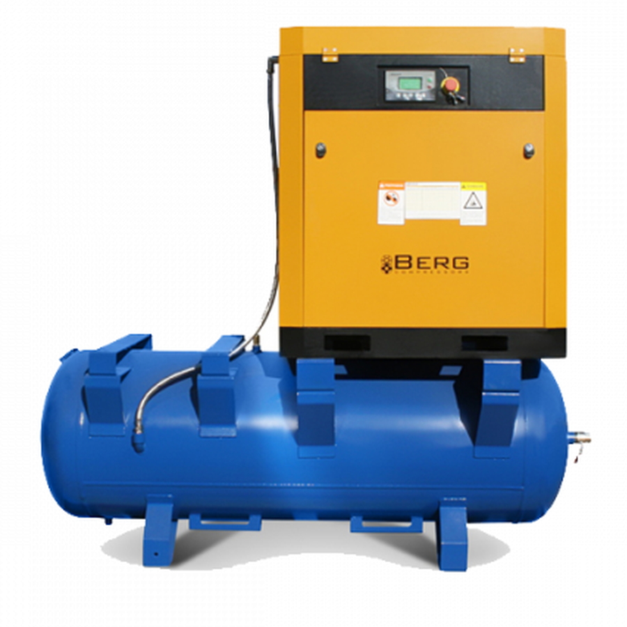 Компрессор винтовой BERG ВК-7.5Р-500 7-10 бар на горизонтальном ресивере ременной привод IP54 нагнетает воздушную массу типа винтовой пары. При ременном приводе компрессорный блок соединен посредством шкивов и ремней с приводным двигателем. Компоновка компрессора на ресивере позволяет существенно сэкономить место в помещении.