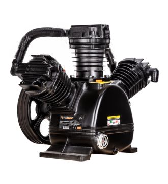 Компрессорная головка ременная AEROMAX B3100 – это сменная помпа (нагнетательная часть) для поршневых ременных масляных воздушных компрессоров. В конструкции головки три поршня диаметром 90 мм. Мощность подключаемого электродвигателя должна быть не менее 11 кВт. При данной мощности производительность на входе может достигать 1350 л/мин при рабочем давлении до 12,5 бар. Рёбра охлаждения (рубашки) на цилиндрах и лопасти на ведомом шкиве обеспечивают эффективное охлаждение. Ведомый двухручейковый предустановлен и идёт в комплекте. Для смазки цилиндропоршневой группы предусмотрен встроенный масляный картер для компрессорного масла VDL 100. Подключение к компрессору механическое - через ременную передачу. Воздушная магистраль от ресивера компрессора подключается к выпуску компрессорной головки. Электромотор компрессора через ременную передачу вращает шкив компрессорной головки, приводя в движение поршни внутри цилиндров, которые соответственно тактам производят забор воздуха из окружающей среды через впускное отверстие и под давлением закачивают его в ресивер компрессора по воздушной магистрали. На впуск необходимо установить воздушные фильтры с посадочной резьбой M33 х 1,5 (приобретаются отдельно).