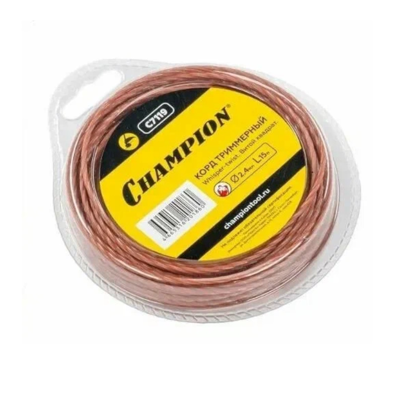 Корд триммерный Champion Whisper-twist C7119 с диаметром 2,4 мм и длиной 15 метров, имеющий витой квадратный профиль, предназначен для использования в садовых триммерах