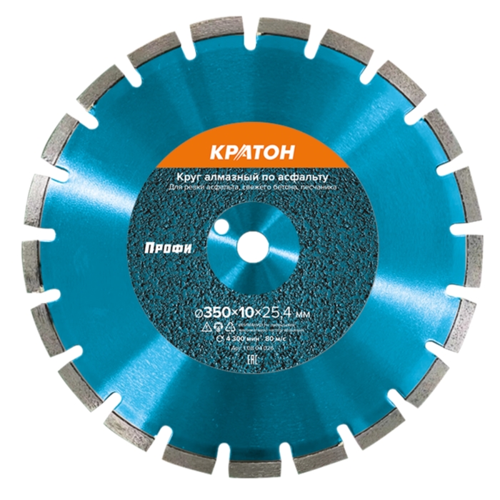 Круг алмазный по асфальту Кратон Профи Ø350х25.4х10 мм используется для резки асфальта, пенобетона, абразивного песчаника, шамотного и силикатного кирпича.
