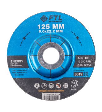 Шлифовальный диск FTL Energy 125 х 6,0 х 22,2 мм A30TBF – расходный материал для ручной угловой шлифовальной машины при работе с изделиями из чёрных металлов (чугуна). Диск предназначен для шлифовки и обдирки разных видов поверхностей, зачистки сварных швов, арматуры, профильных труб, стальных уголков, швеллера, удаления краски, ржавчины, обработки кромок. Поверхность куполообразного диска покрыта слоем абразивных частиц, скрепленных между собой бакелитовой связкой, и армирована одной стекловолоконной сеткой и тканой подложкой. Двойное металлическое кольцо обеспечивает плотную посадку на фланец УШМ, исключая биения и вибрацию при работе. Поставляется во влагозащитной упаковке. Особенность серии ENERGY - крупнозернистый абразивный состав высокой твёрдости для чёрных металлов на базе оксида алюминия. Не рекомендуется для работы с изделиями из нержавеющей стали.